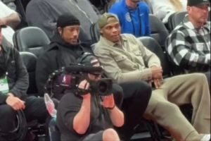 心情不错!德罗赞和威少开拓者主场观战耐克峰会 两人有说有笑