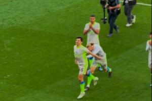 羞涩小胡!胡桑诺夫赛后不好意思接受掌声,哈兰德把他推到看台前